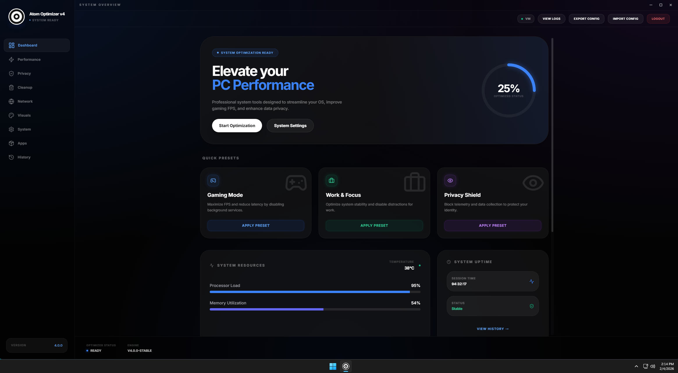 Disclaimer: ATOM OPTIMIZER modifies system settings. While all changes are reversible, we recommend creating a system restore point before use.